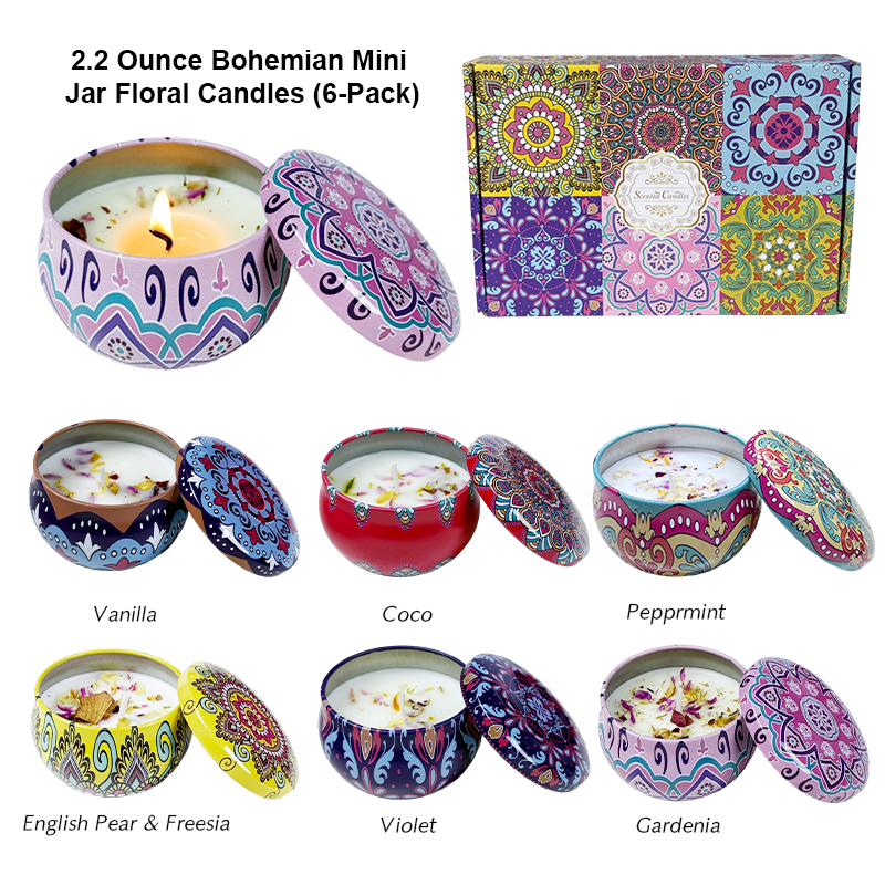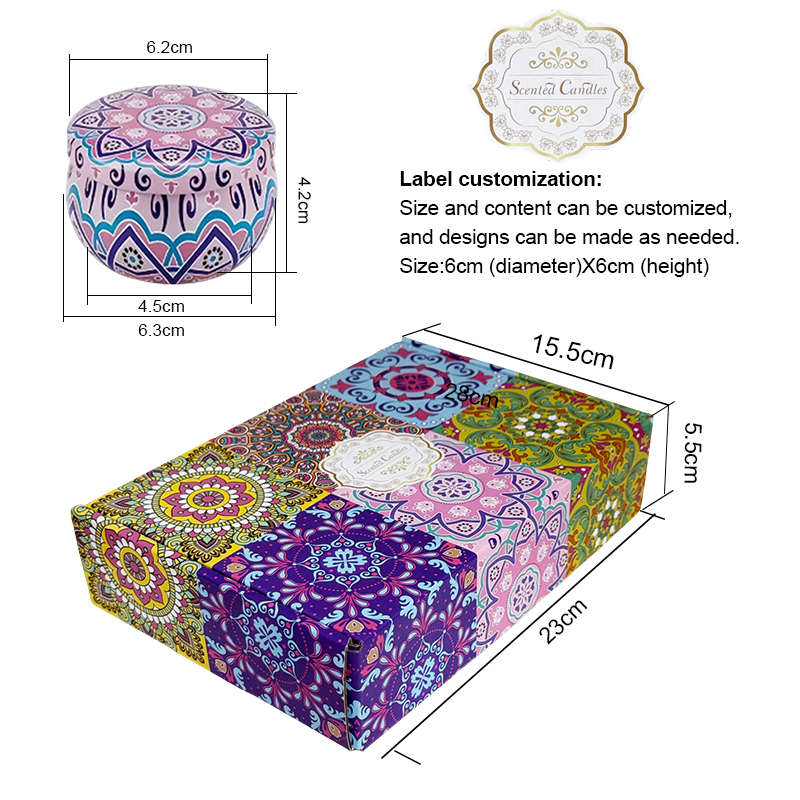 This set contains six 2.2 - ounce Bohemian small tin candles with flower sprinkles. Inspired by the Bohemian style, the tins are decorated with colorful and elaborate ethnic - style patterns, highly artistic. Each tin has a capacity of 2.2 ounces. Natural flower petals are incorporated into the candles. When lit, the soft candlelight combined with the light and elegant fragrance creates a romantic and cozy atmosphere. It can be used for daily home aromatherapy and ambiance creation, and is an exquisite little item to adorn life.