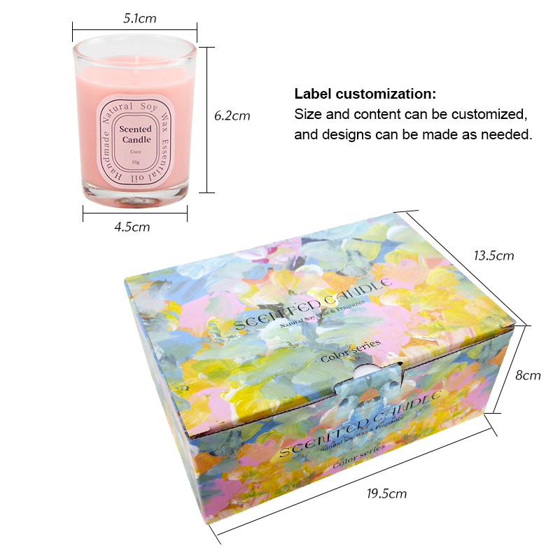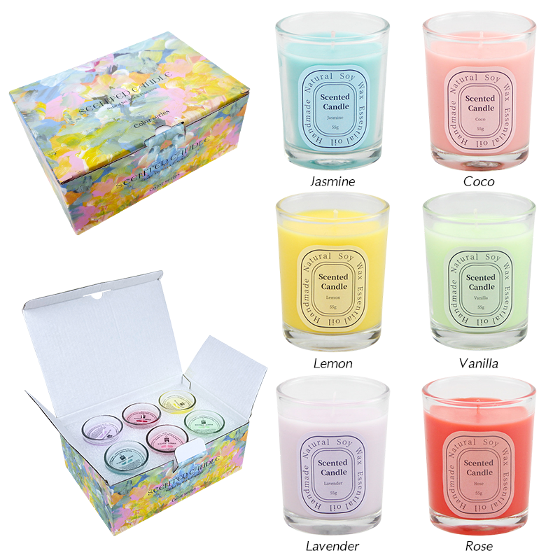 The candles are mainly made of natural soy wax and paired with eco - friendly cotton wicks. They burn stably and last long, producing almost no black smoke, being environmentally friendly and healthy. The six candles respectively emit different charming scents, which may be the romantic fragrance of roses, the soothing aroma of lavender, the fresh fruity scent of lemons, etc., catering to different olfactory preferences. The exquisite colorfully - doodled gift box packaging is stylish and beautiful. It is very suitable for decorating homes, creating atmospheres, or being given as gifts.