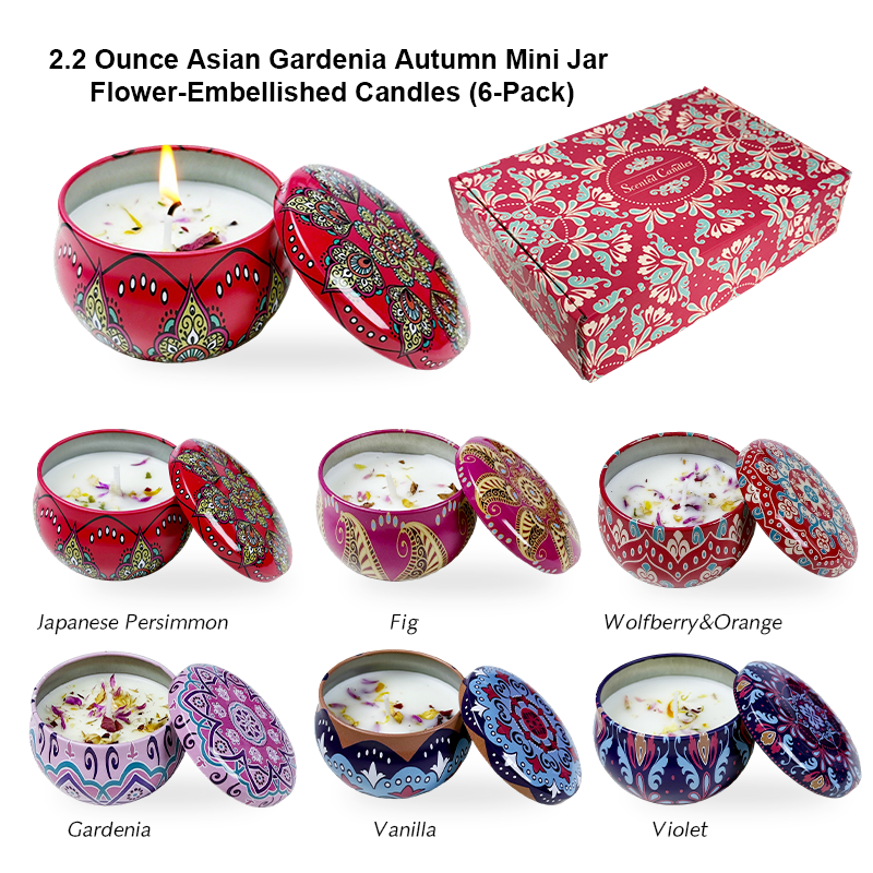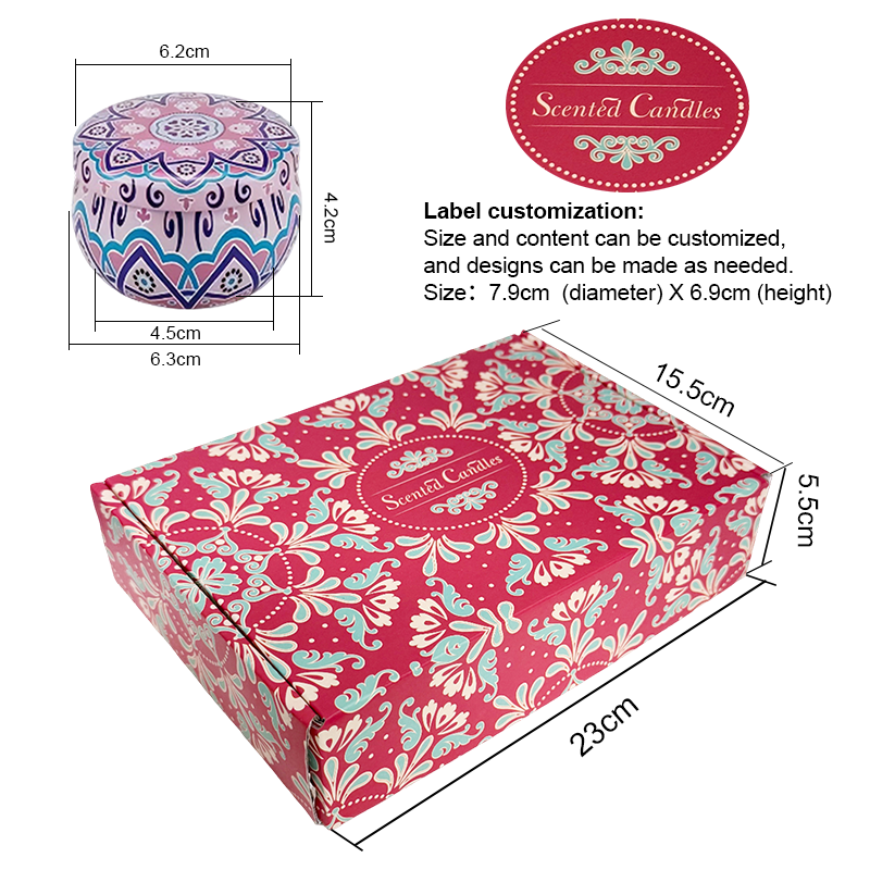 This set contains six 2.2 - ounce Bohemian small tin candles with flower sprinkles. Inspired by the Bohemian style, the tins are decorated with colorful and elaborate ethnic - style patterns, highly artistic. Each tin has a capacity of 2.2 ounces. Natural flower petals are incorporated into the candles. When lit, the soft candlelight combined with the light and elegant fragrance creates a romantic and cozy atmosphere. It can be used for daily home aromatherapy and ambiance creation, and is an exquisite little item to adorn life.